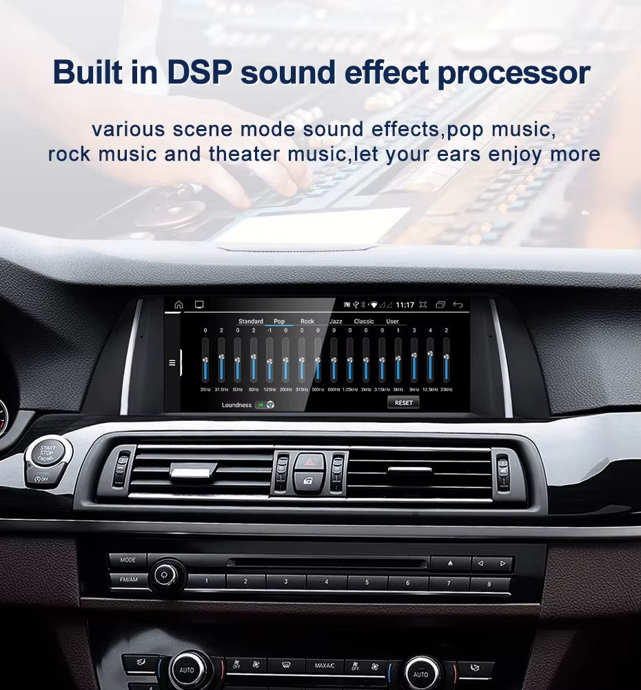 Upgrade your BMW 5 Series F10 F11 with the 10.25-inch Android 14 multimedia head unit featuring Qualcomm Snapdragon performance. Enjoy wireless Apple CarPlay, Android Auto, smooth navigation, and seamless integration with your car’s system.